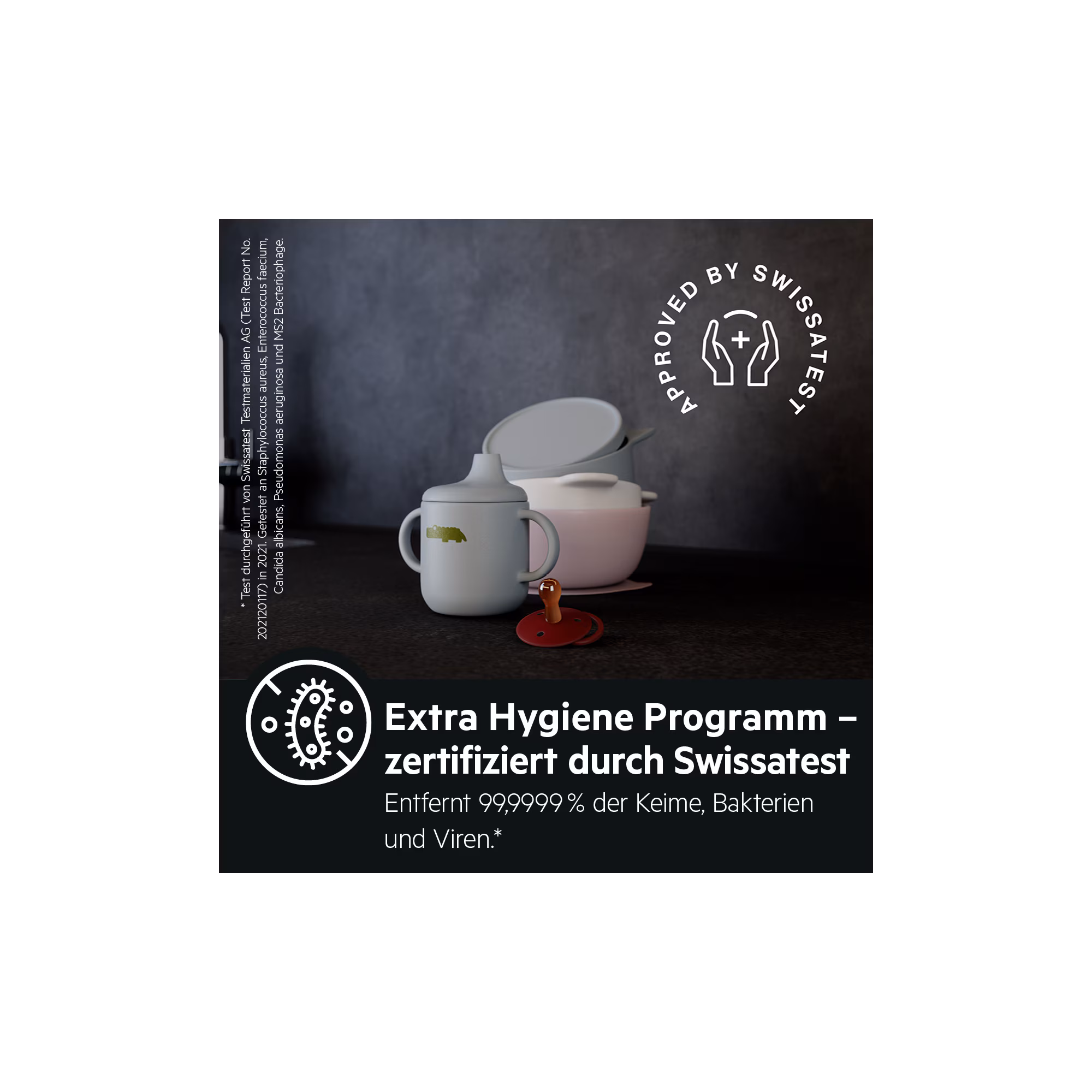 - ExtraHygiene-Programm: Hygienische Reinigung bei 69 °C für die Entfernung von Keimen und Bakterien.
