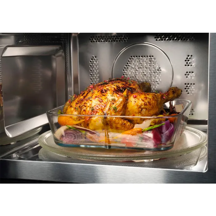 Kombiniertes Garen (Mikrowelle & Grill) Die Dual-Funktion ermöglicht es, die Schnelligkeit der Mikrowelle mit der Bräunungsleistung des Grills zu verbinden. So werden Gerichte im Inneren gleichmäßig heiß und außen appetitlich braun und knusprig – ideal für Gratins oder kleine Braten.