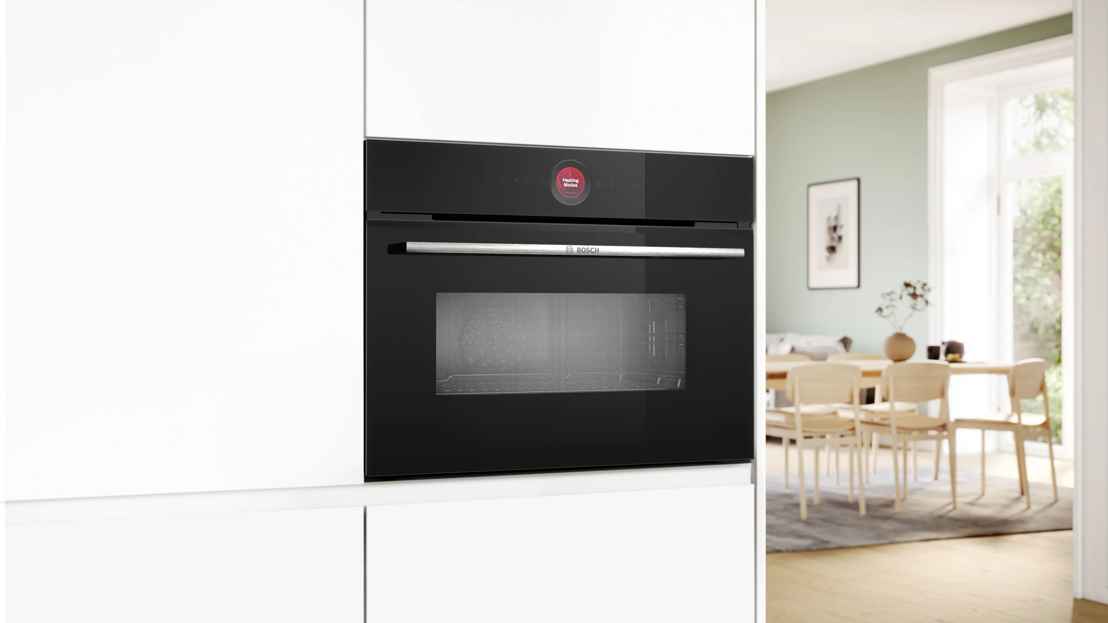 Der Bosch CMG7241B1 ist ein intelligenter Kompaktbackofen, der die Flexibilität eines vollwertigen Ofens mit der Geschwindigkeit einer Mikrowelle kombiniert. Durch seine kompakte Bauhöhe von 45 cm ist er ideal für kleinere Küchen oder als Zweitgerät in Augenhöhe geeignet. Das Design besticht durch die Kombination aus schwarzem Glas und dem digitalen Bedienring im hochauflösenden TFT-Touchdisplay.