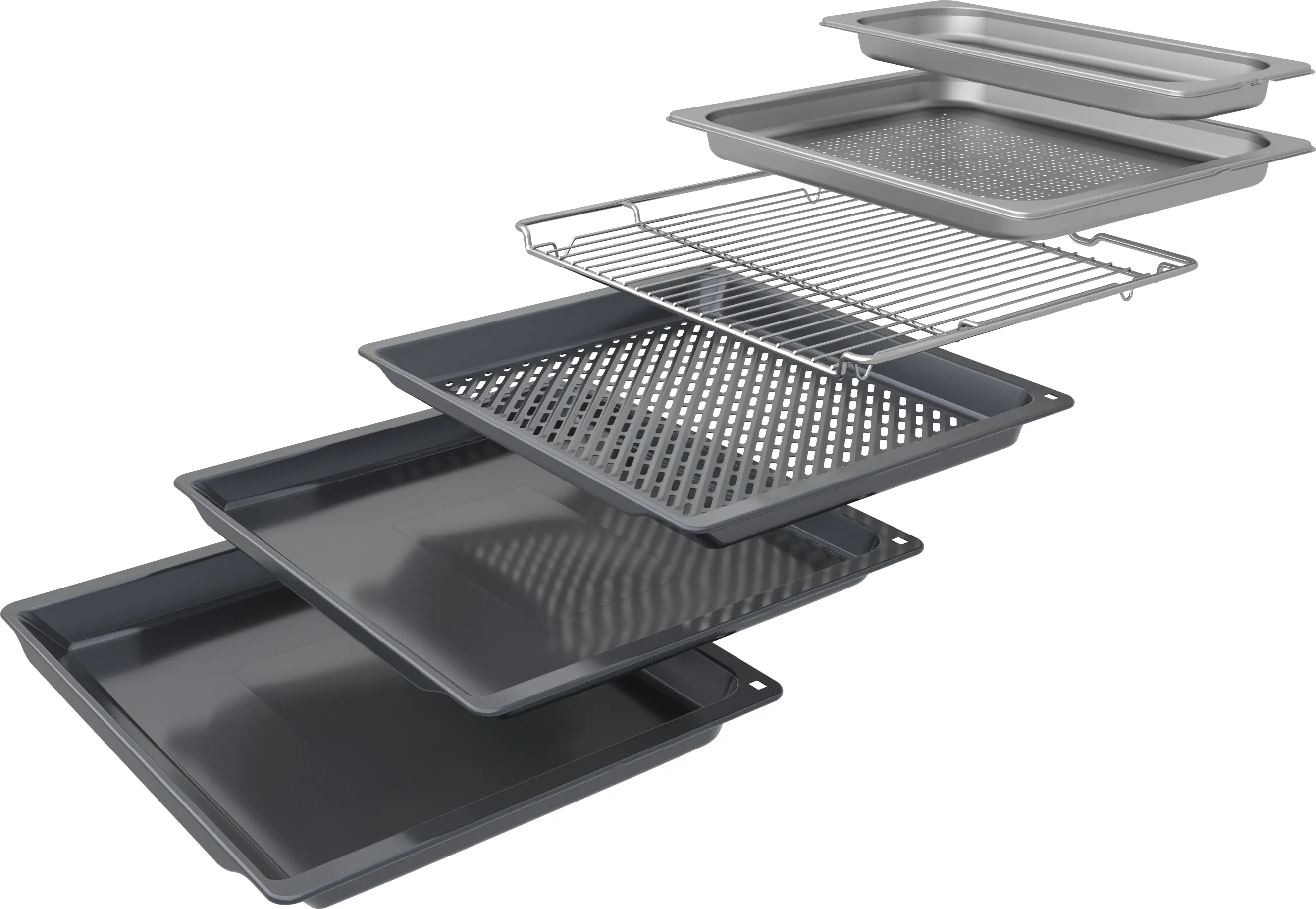 - 1 x Backblech emailliert, 1 x Dampfbehälter, gelocht, Größe M, 1 x Dampfbehälter, gelocht, Größe XL, 1 x Dampfbehälter, ungelocht, Größe M, 1 x Rost, 1 x Universalpfanne