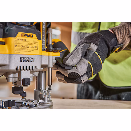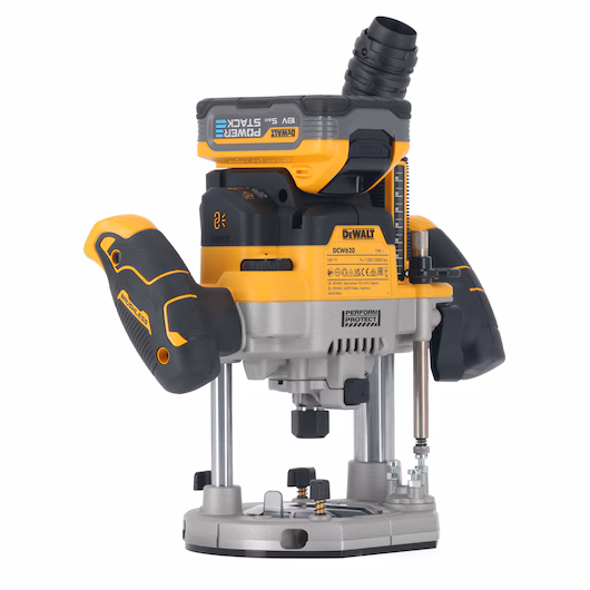 Die DeWalt DCW 620 Akku Oberfräse ist ein leistungsstarkes und professionelles Werkzeug für präzise Fräsarbeiten im Holz- und Möbelbau – flexibel, sicher und kabellos. Ausgestattet mit einem kraftvollen Motor, der über 1.600 Watt Abgabeleistung bietet, meistert die Oberfräse auch anspruchsvollste Anwendungen mühelos. Dank der Drehzahlvorwahl von 11.000 bis 23.000 U/min in Kombination mit der elektronischen Drehzahlkonstanthaltung bleibt das Fräsbild selbst unter Last stets sauber und gleichmäßig. Die Perform & Protect-Technologie mit integriertem Anti-Rotations-System erhöht die Sicherheit, indem sie die Maschine bei plötzlichem Kickback sofort stoppt. Eine LED-Überlastwarnung signalisiert zuverlässig, wenn die Maschine an ihre Belastungsgrenze kommt. Für höchste Präzision sorgt die Tiefenfeineinstellung mit praktischer Arretierung, sowie ein dreistufiger Revolvertiefenanschlag für wiederholgenaue Serienfräsungen. Der mitgelieferte Parallelanschlag mit Feinjustierung unterstützt präzises Arbeiten entlang von Kanten. Die Spindelarretierung ermöglicht einen schnellen, werkzeuglosen Fräserwechsel. Für eine saubere Arbeitsumgebung ist die Maschine mit einem Air-Lock kompatiblen Absaugadapter sowie einem ansteckbaren Unterboden-Absaugstutzen für Kantenfräsungen ausgestattet.