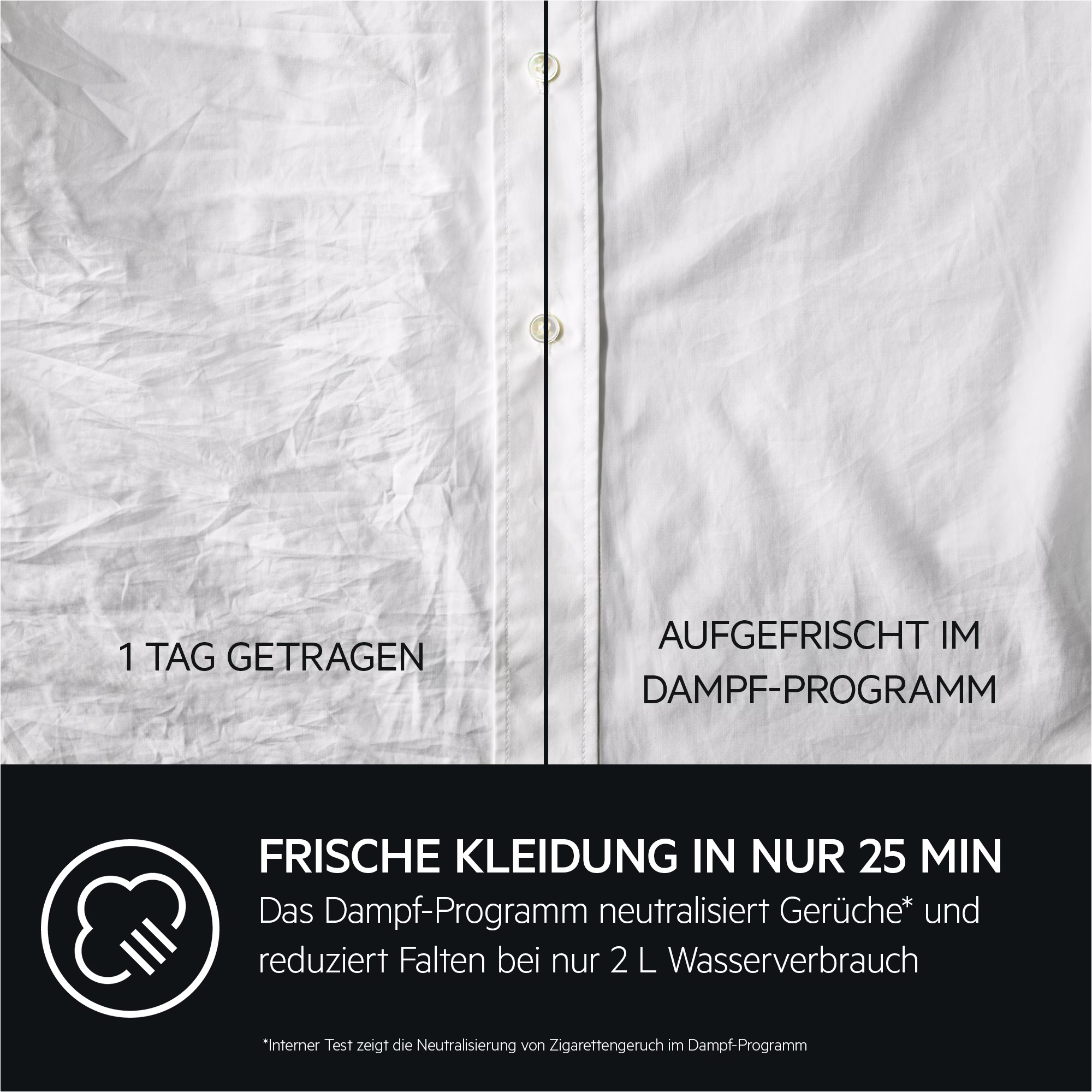 ProSteam Dampf-Programm: Mehr Frische und weniger Falten für deine Textilien* Das Dampf-Programm neutralisiert Gerüche* und reduziert Knitterfalten auf Kleidungsstücken, einschließlich Feinwäsche, in nur 25 Minuten. Für einen zusätzlichen Frische-Effekt füge einfach den AEG Steam Fragrance Wäscheduft hinzu.