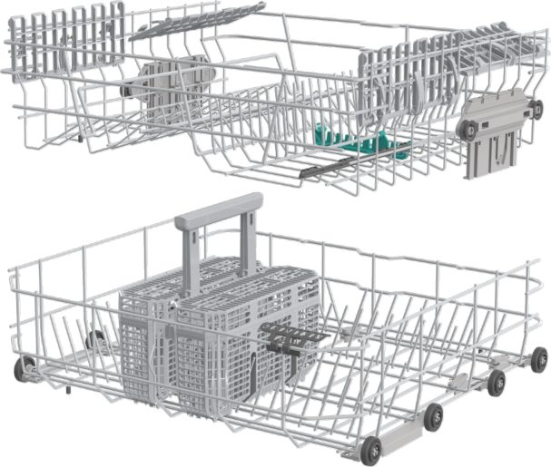 Flexibles Korbsystem: Bestehend aus zwei Geschirrkörben. Der Oberkorb ist höhenverstellbar, um unten Platz für größere Töpfe zu schaffen.
