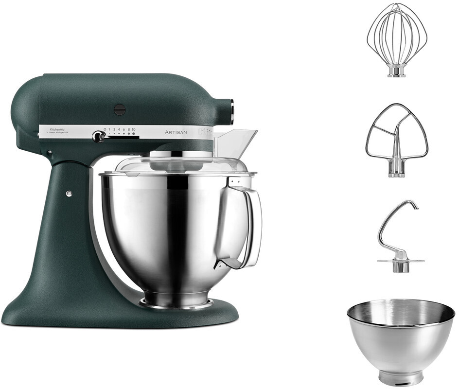 The legendary KitchenAid Artisan 5KSM185PSEPP in Pebbled Palm combines design, power, and versatility for creative cooks and bakers. With over 100 years of experience, it stands for reliability, durability, and iconic design. It comes with a 4.8 L stainless steel bowl, an additional 3 L bowl, and high-quality stainless steel attachments – ideal for both large and small preparations.