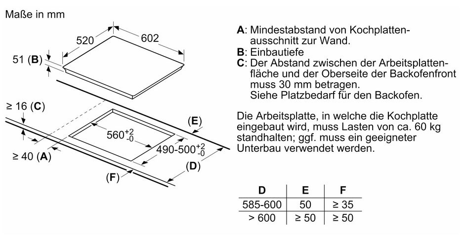 - Gerätehöhe über Arbeitsplatte: 6,0 mm